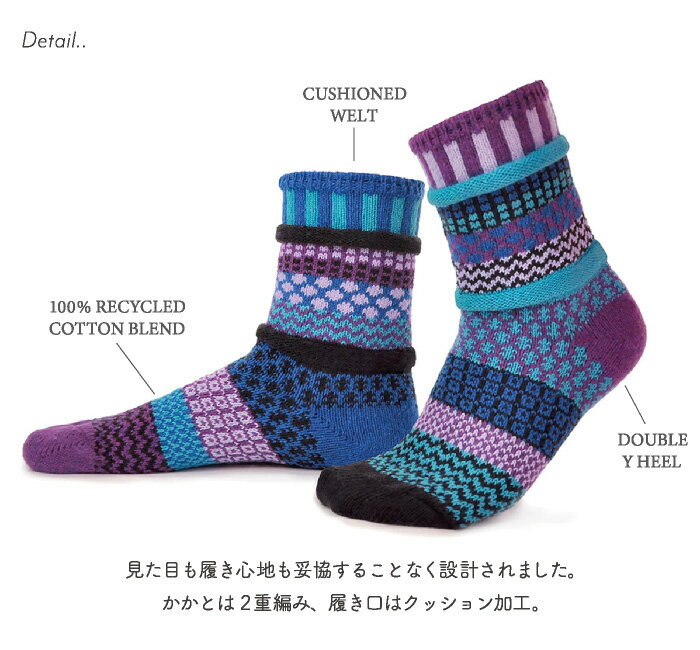 スペック ■商品名 solmate socks ソルメイトソックス クルーソックス LEGENDS Crew Socks ■素材 再生繊維(コットン)62% 再生繊維(ポリエステル)22% ナイロン 15% ポリウレタン 1% ■カラー ミッドナイト、ラズベリー、コスモス、ダリア、ブルーベル、サニー、フォールフォウリイジ 、ジェムストーン ■サイズ(約) S(22-25cm)、M(25-27cm)、L(27-29cm) ■生産国 アメリカ ■お手入れ方法 水洗いにより若干縮む場合がございます。