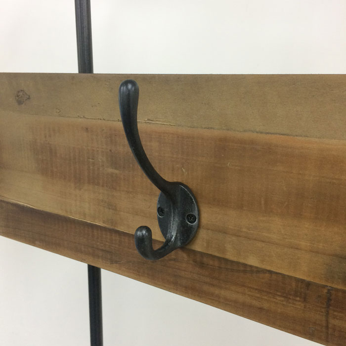 size:W1000×D400×H1800 本体:モミ古材 クリア塗装仕上げ 金物:スチール 黒皮風塗装仕上げ 組立式(六角ボルト用工具付) ※フック等、木ビスを使う箇所があります。