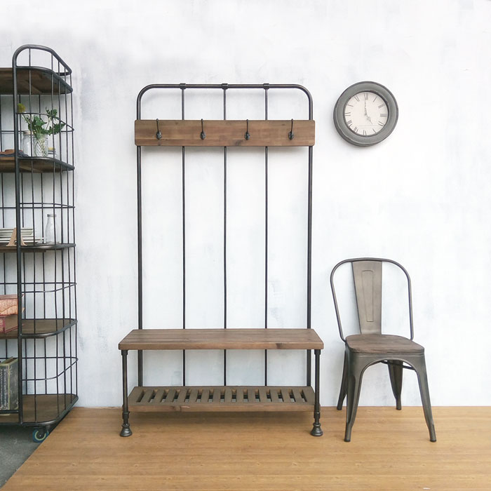 ハンガーラック 古材 フックハンガー 幅100cm 【送料無料】【日時指定不可】 コートハンガー 洋服掛け 収納家具 ハンガー 無垢 木製 天然木 天板 ブラウン 茶 茶色 スチール アイアン ヴィンテージ アンティーク インダストリアル おしゃれ カフェ 在宅ワーク テレワーク