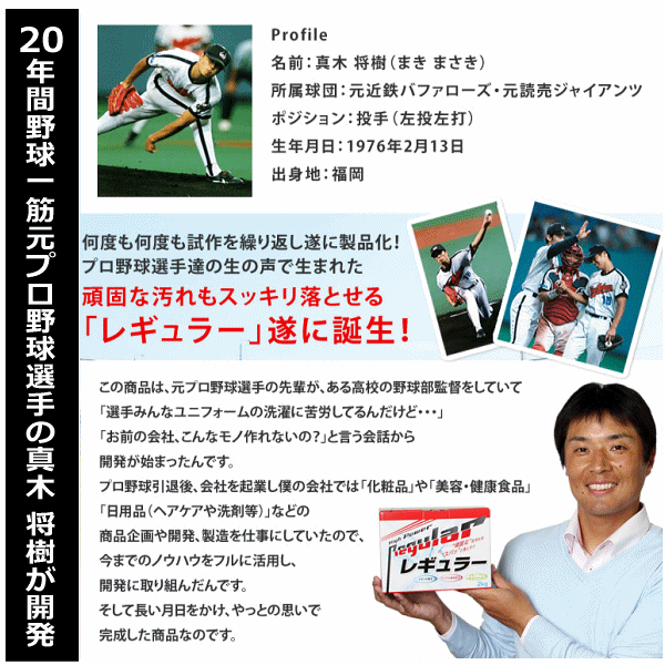 メーカー希望小売価格はメーカーカタログに基づいて掲載しています item-Information 【商品詳細説明】 ■メーカー アルク有限会社 ■品名 泥汚れ用洗剤 レギュラー 4kg ■内容量 4kg ■主成分 界面活性剤(18%、ポリオキシアルキレンアルキルエーテル、アルファオレフィンスルホン酸ナトリウム)、リン酸塩(P2O5として37%)、漂白剤(酵素系)、再汚染防止剤、酵素、蛍光増白剤 ■商品説明 元プロ野球選手 真木将樹さんが開発! プロ野球選手達の生の声で生まれたガンコな汚れも スッキリ落とせる洗剤「レギュラー」 泥汚れ用洗剤「レギュラー」の特徴 ・ユニフォーム(練習着)・トレーニングシューズの頑固な汚れ (ガンコな汚れ)が簡単に白くなる。