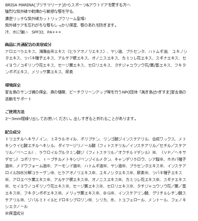 □商品詳細 ■MODEL:アスリートプロ UVリップクリーム 3.3g ■小売希望価格:1,180+(税) ※BRISA MARINAシリーズはこちら ・見落としがちな唇へのフォローアップに!SPF32、PA+++ ・強烈な紫外線や乾燥から敏感な唇を守る、濃密リッチなUVカットリップクリーム。